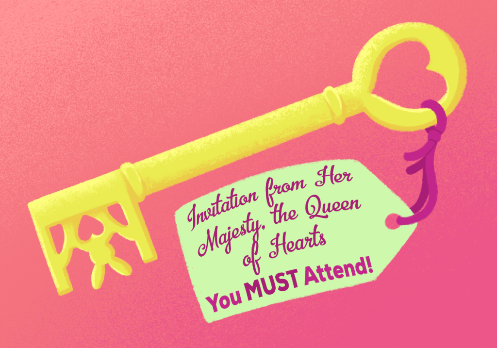 For the tickets, I decided to make an illustration of the key to unlock the door, which tied the ticket design in with the keyhole poster. Also, as the Kingdom of Wonderland is ruled by the Queen of Hearts, a label attached to the key tells the holder that they are invited to the production by Her Royal Majesty.