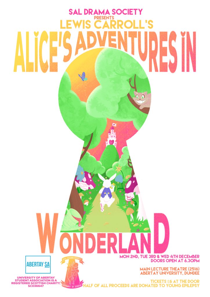 Returning to works of classic literature, the society performed Lewis Carroll’s ‘Alice’s Adventures in Wonderland’. Being one of my favourite works of fiction, I was delighted to return to work on the promotional materials for this production. We discussed several designs; Alice at a crossroads in the Tulgy Wood, a map of Wonderland and a peep down the rabbit hole. In the end, we settled on a design which appears to be a look through the keyhole which leads to the gardens in Wonderland. This gave the viewer the sense that they themselves were entering the dreamy world!