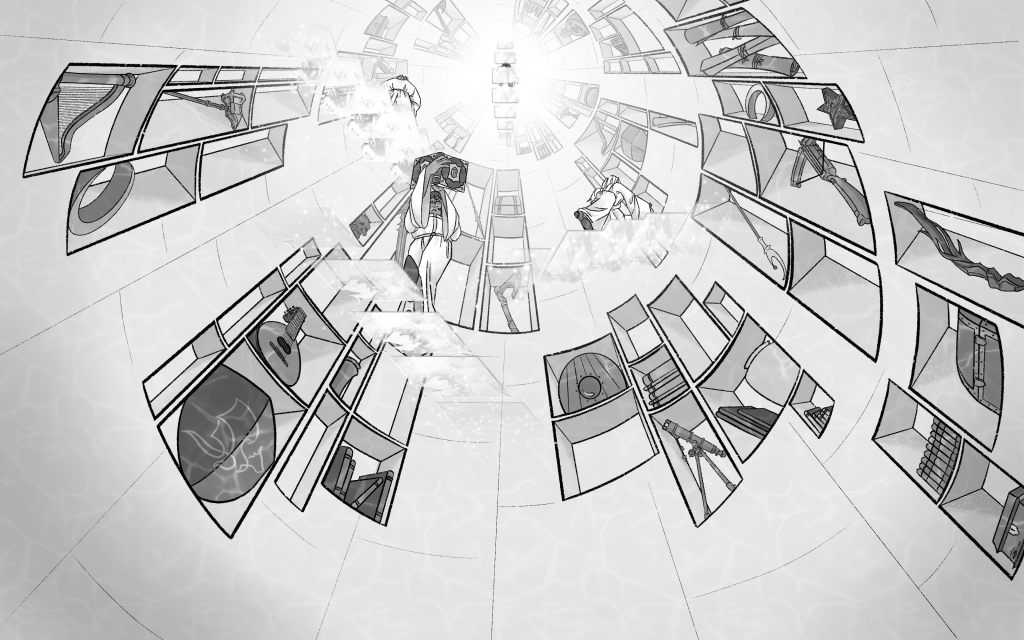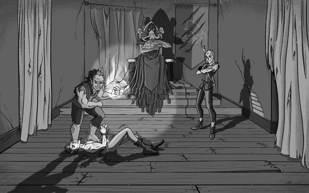 Not long after the Christmas present portraits were completed, I was approached again by the client. Impressed with the art style, they asked if I would be willing to create illustrations for their website. The site would document the Dungeons and Dragons campaign as it progressed, so they needed an illustration to accompany each week’s instalment. Each visual would portray a scene from that week’s adventure and required the themes and hobbies of crocheting, haberdashery and traditional role-playing be implemented in some way.
