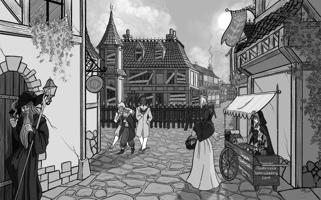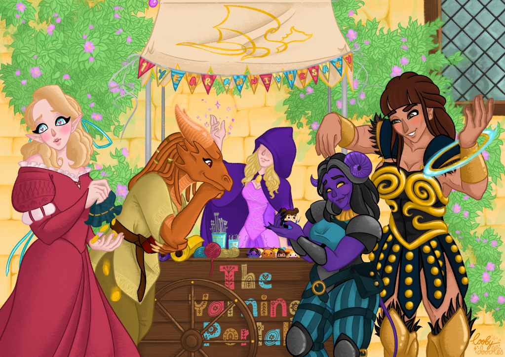 Recently The Yarning Portal reached its 1 Year Anniversary and to celebrate, I created a piece of the role-playing team with the Dungeon Master’s mysterious pedlar character (which I created for the website illustrations) and a wee crochet doll of my in-game character (whom the Dungeon Master created and used in the game to involve me in the fun adventures)!